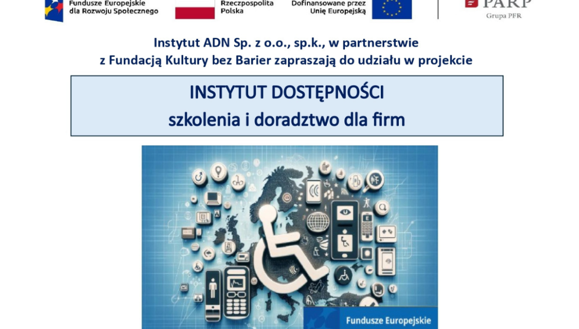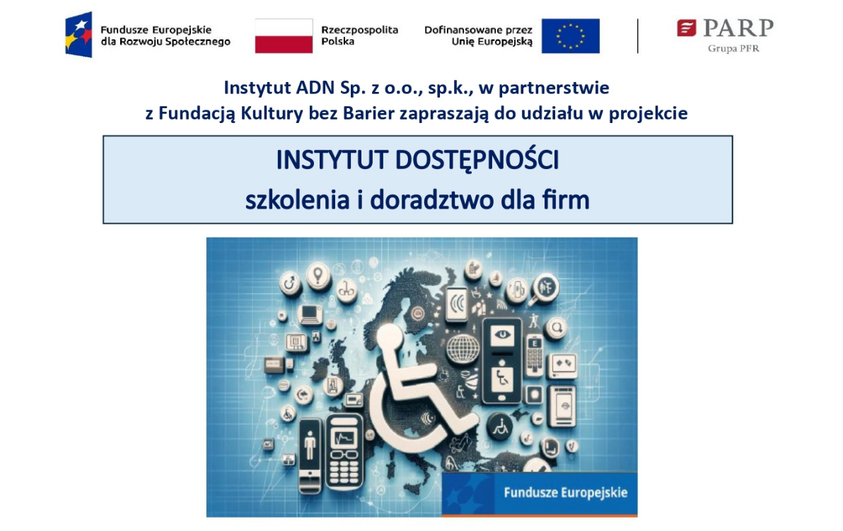 Instytut ADN Sp. z o.o., sp.k., w partnerstwie z Fundacją Kultury bez Barier zaprasza przedsiębiorców oraz pracowników firm do udziału w ogólnopolskim projekcie „Instytut Dostępności – szkolenia i doradztwo dla firm”, realizowanym w ramach programu Fundusze Europejskie dla Rozwoju Społecznego 2021–2027.