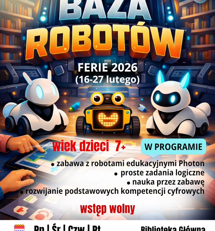 Miejska Biblioteka Publiczna zaprasza dzieci na kolejną atrakcję przygotowaną z myślą o feriach zimowych – Biblioteczną Bazę Robotów. Zajęcia mają charakter edukacyjno-rekreacyjny i łączą naukę z zabawą.
